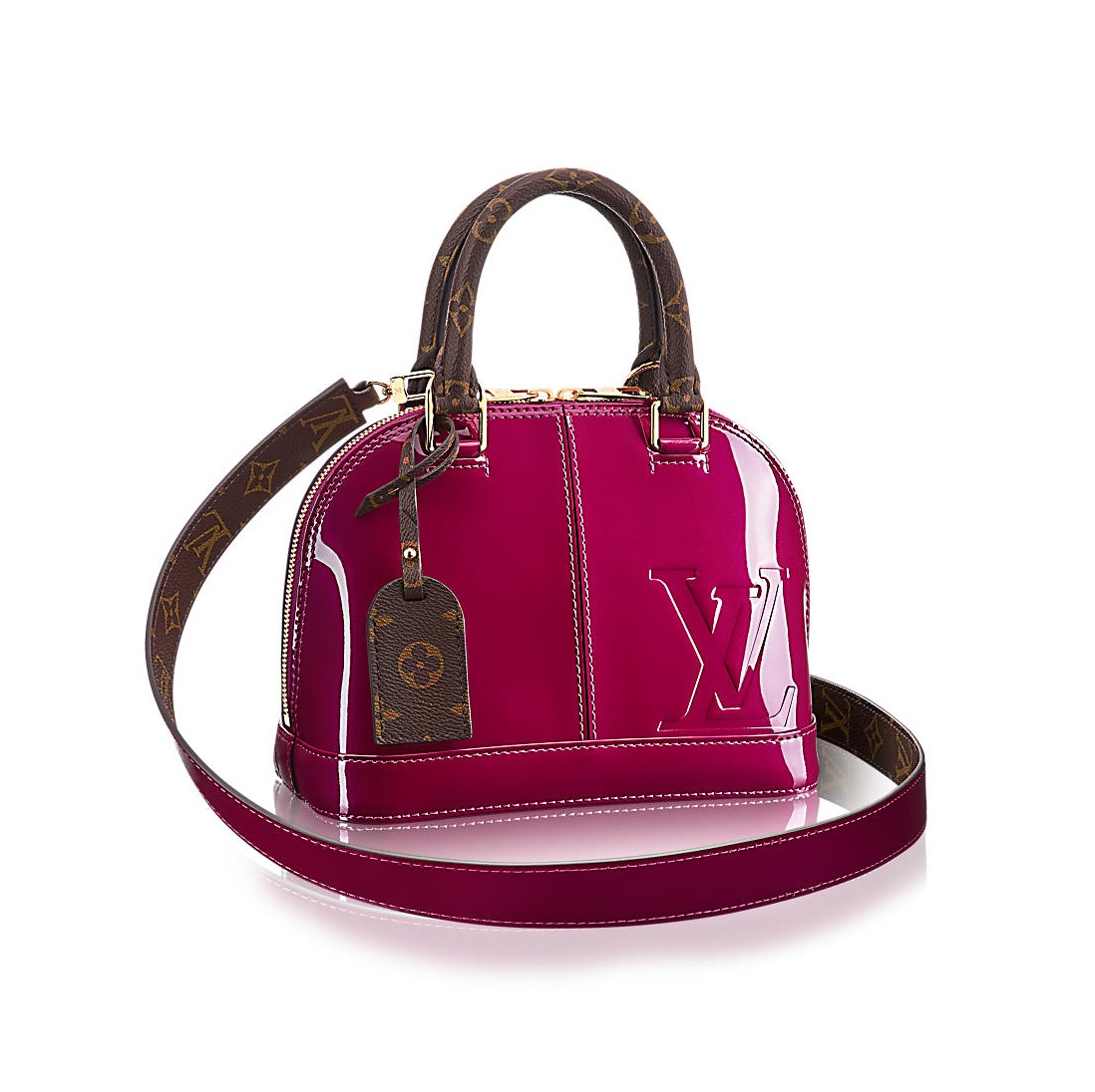 For Fall 2017, the House continues to reveal new facets of Vernis leather with an unexpected reinterpretation of one of Louis Vuitton’s most iconic shapes: the Alma BB. The audacious color and Monogram canvas trim gives it a stunningly disruptive feel.