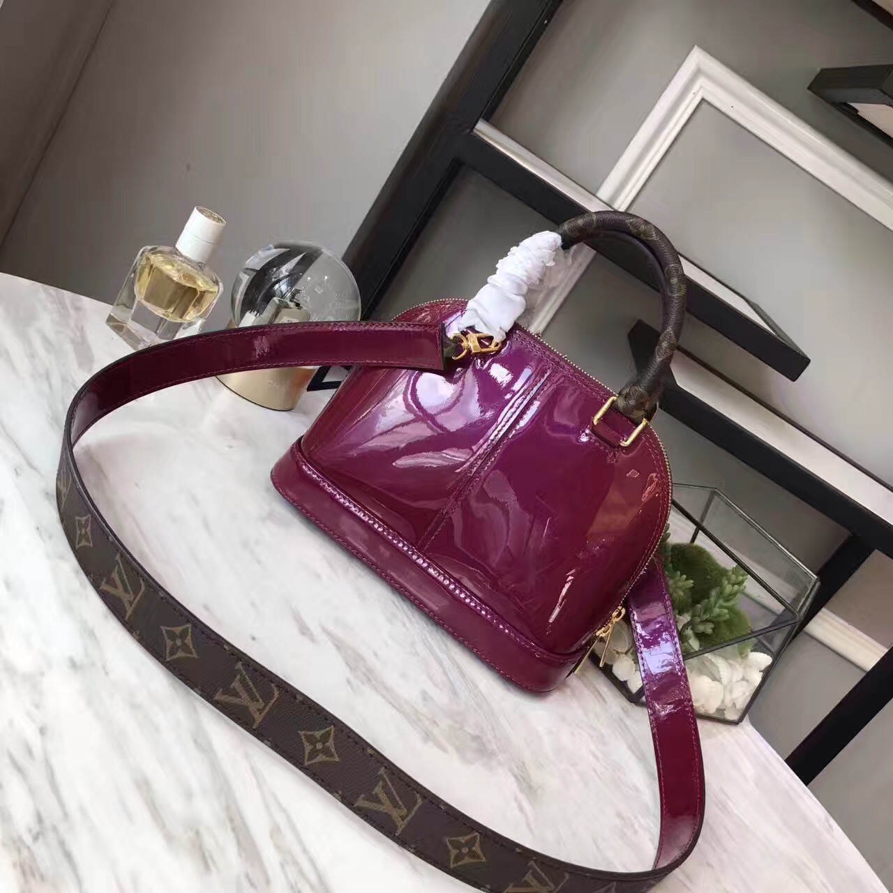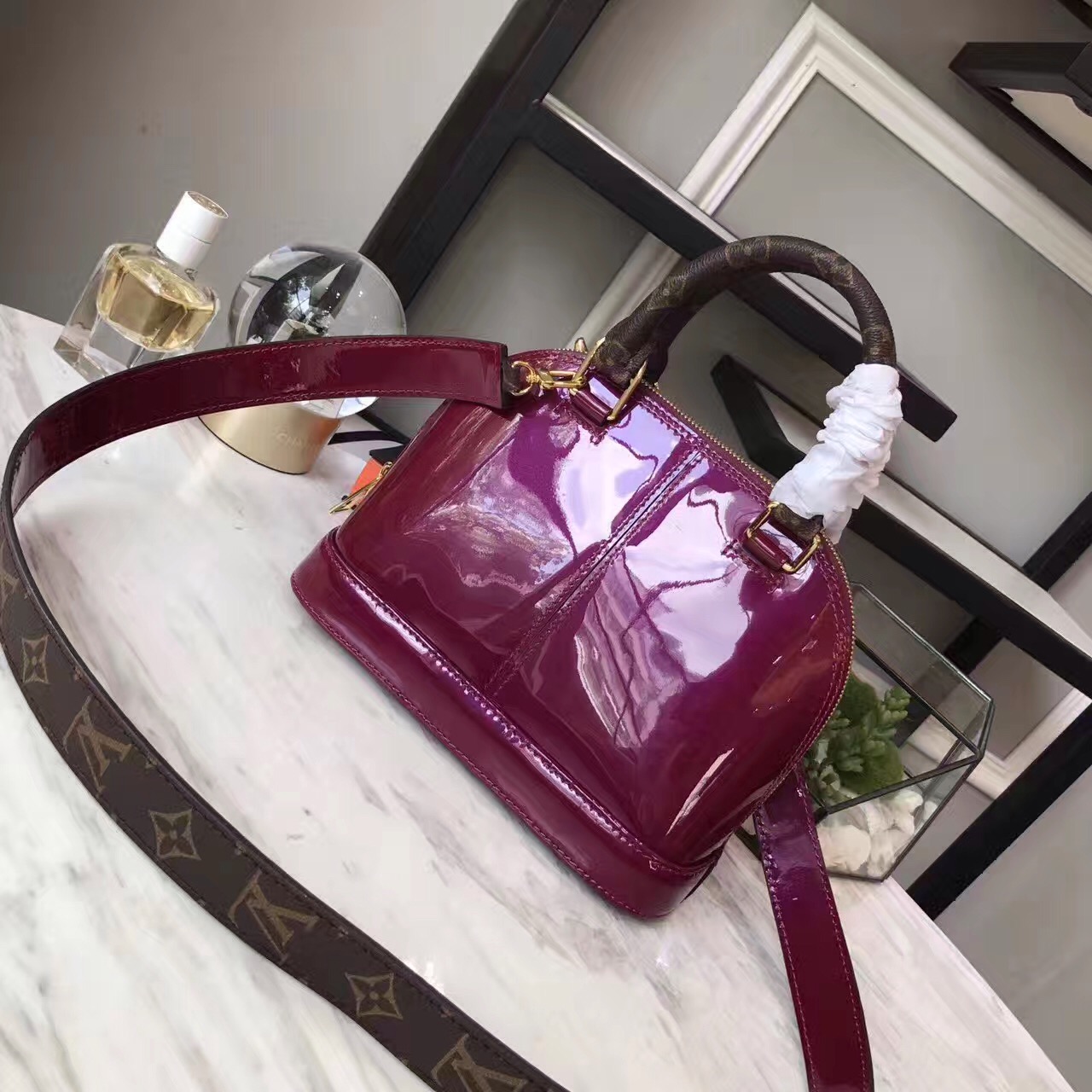 - 1 removable non-adjustable Monogram canvas & patent calf leather strap