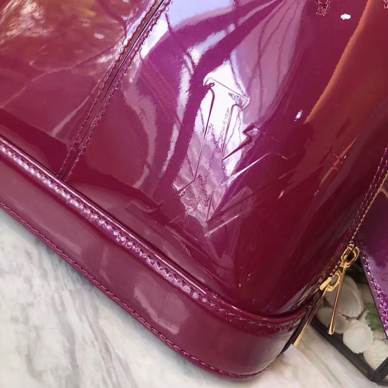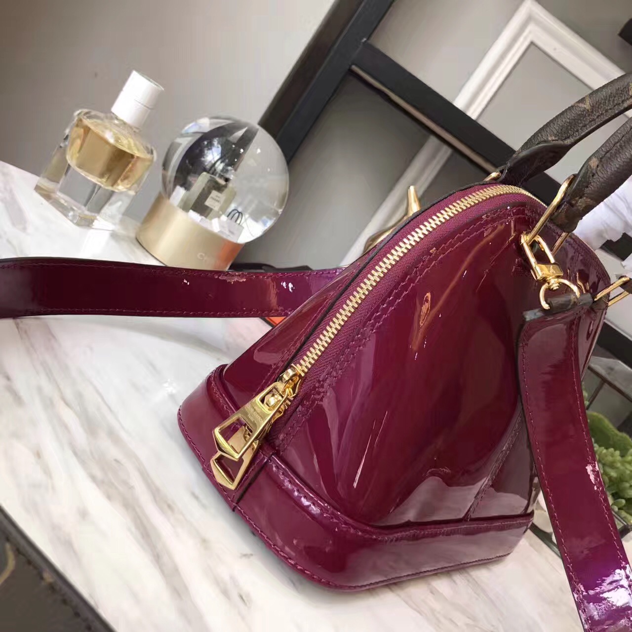 - Monogram canvas and patent calf leather trim