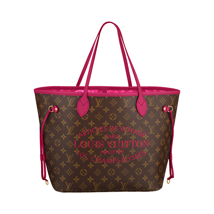 The Monogram canvas Neverfull MM boasts some distinctive summery touches. These include a brightly coloured " Articles de voyages" motif on the outside and a dazzling ikat flower design on the inside.