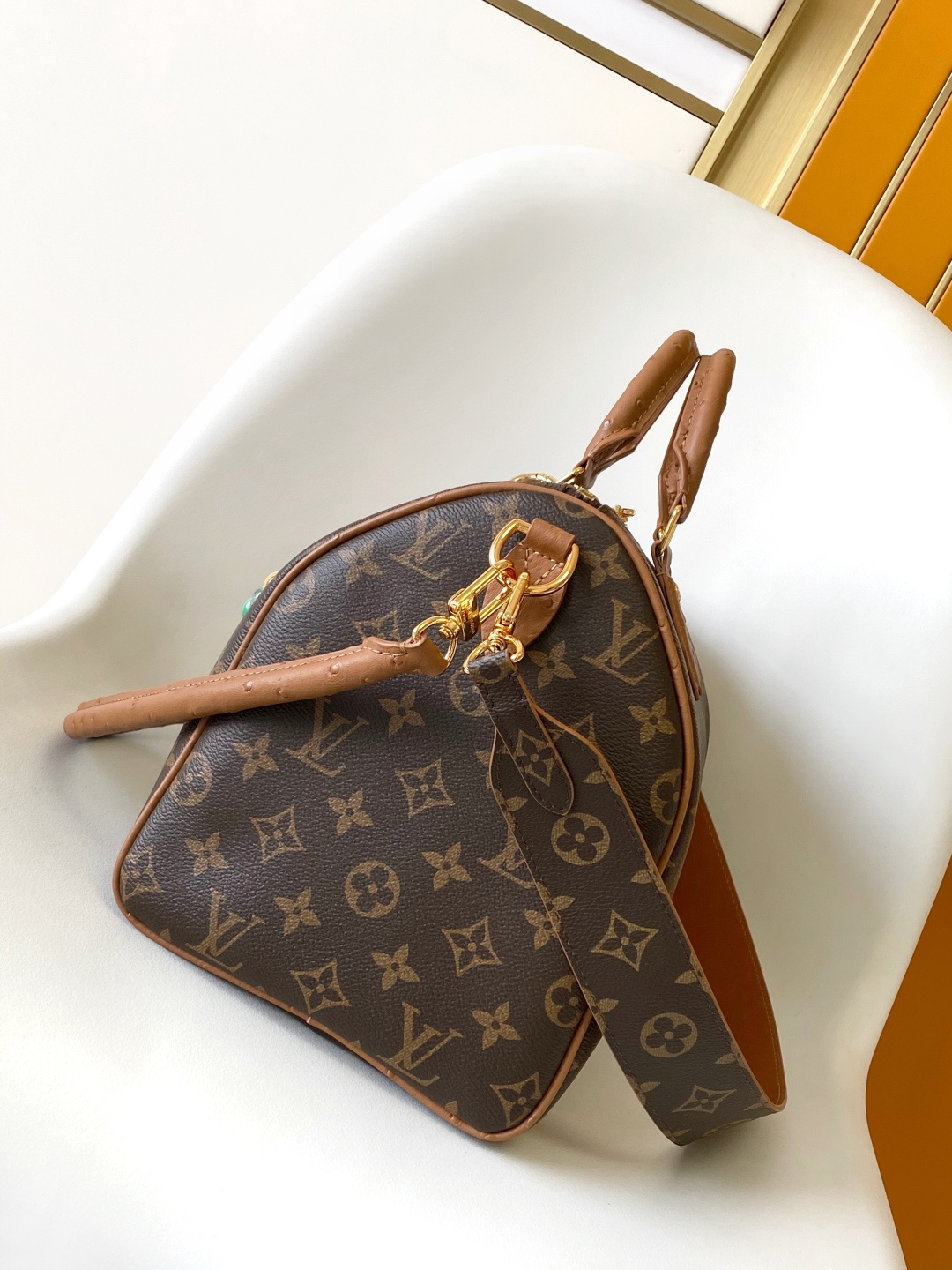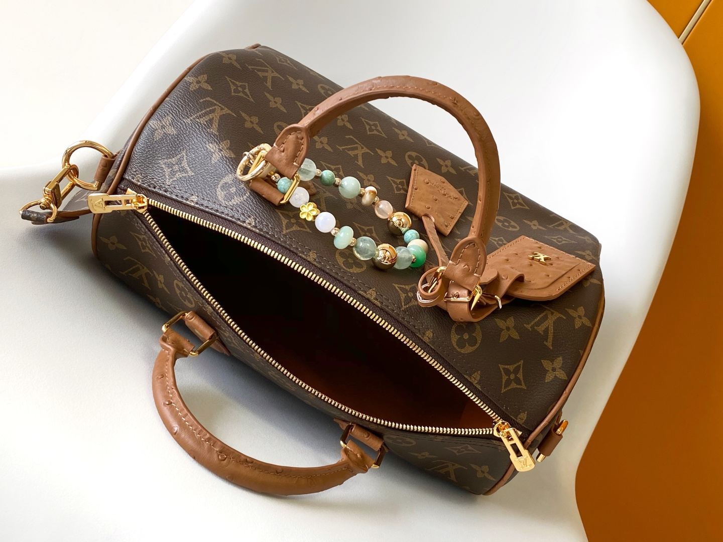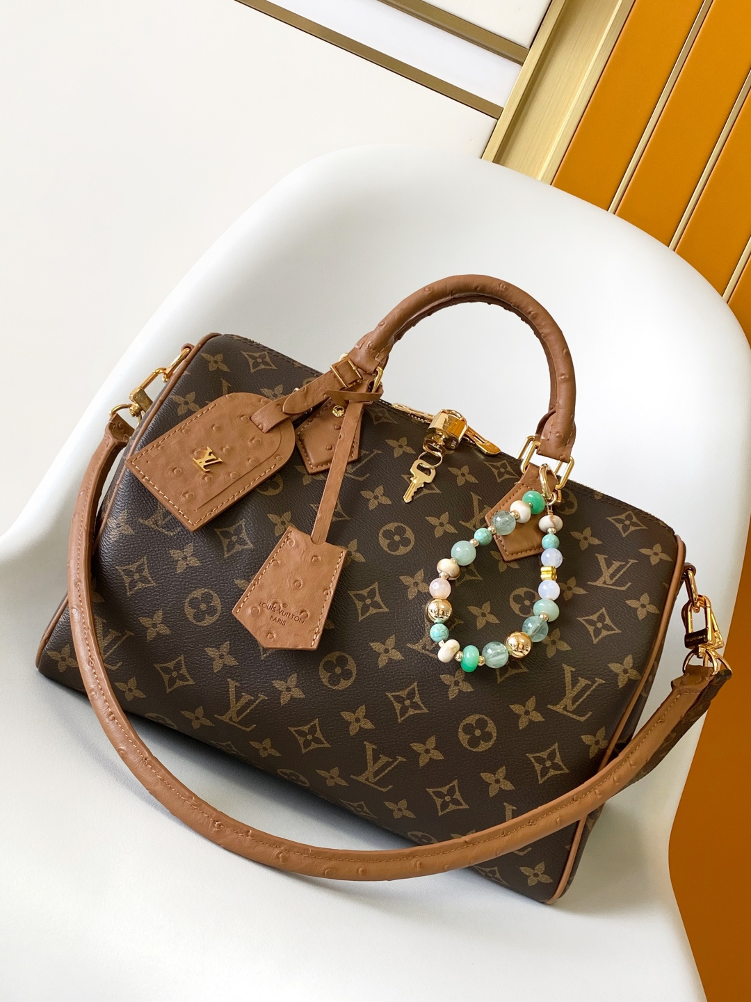 This Speedy Soft 30 Boho stands out with a plethora of embellishments, from an exclusive ostrich-leather trim to the colorful pearl chain. Crafted from the House’s iconic Monogram coated canvas, it has a contrasting leather lining complete with an internal zipped pocket. It is finished with a signature key bell and an address tag, and can be worn multiple ways thanks to the new shoulder Toron handle.